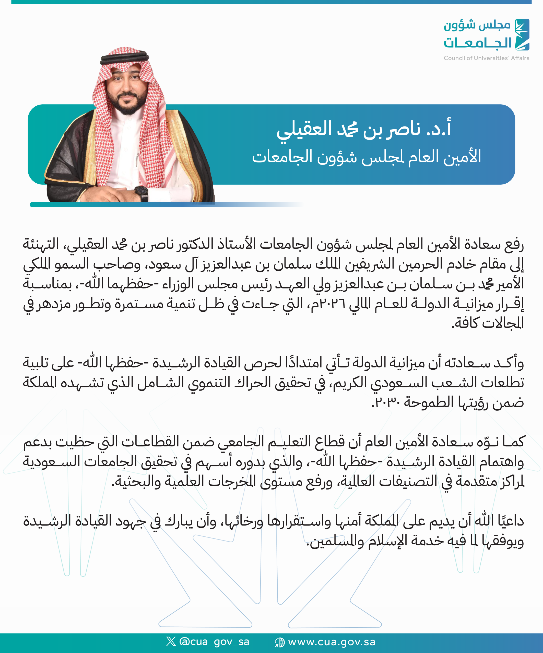 رفع سعادة الأمين العام لمجلس شؤون الجامعات الأستاذ الدكتور ناصر بن محمد العقيلي، التهنئة إلى مقام خادم الحرمين الشريفين الملك سلمان بن عبدالعزيز آل سعود، وصاحب السمو الملكي الأمير محمد بن سلمان بن عبدالعزيز ولي العهد رئيس مجلس الوزراء -حفظهما الله-، بمناسبة إقرار ميزانية الدولة للعام المالي 2026م، التي جاءت في ظل تنمية مستمرة وتطور مزدهر في المجالات كافة.