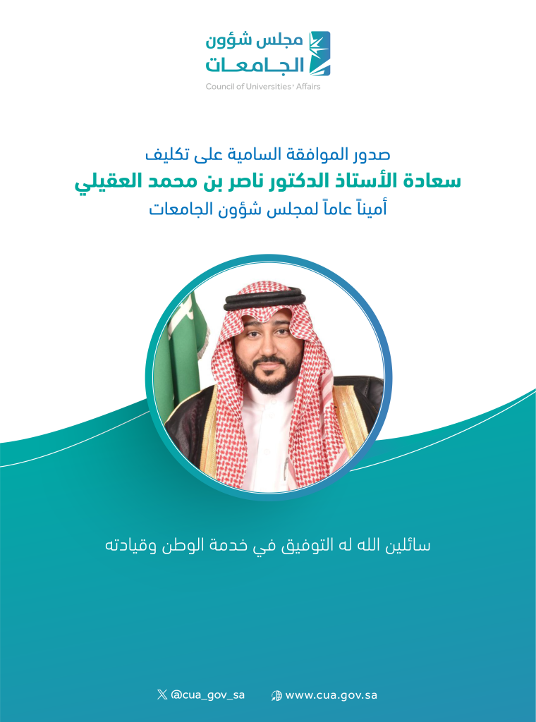 Share this post Facebook Twitter LinkedIn Google + Email صدور الموافقة السامية على تكليف سعادة الأستاذ الدكتور ناصر بن محمد العقيلي أميناً عاماً لمجلس شؤون الجامعات amzahrani2025-10-08T13:33:03+00:00